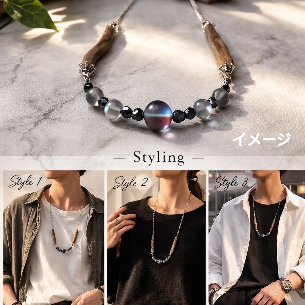 ・流木のナチュラルな質感とルナフラッシュの輝きが生み出す絶妙なコントラストで、さまざまなファッションにマッチします。サイズはチェーン約60cm+アジャスター約5cmで、長さ調整可能です。
