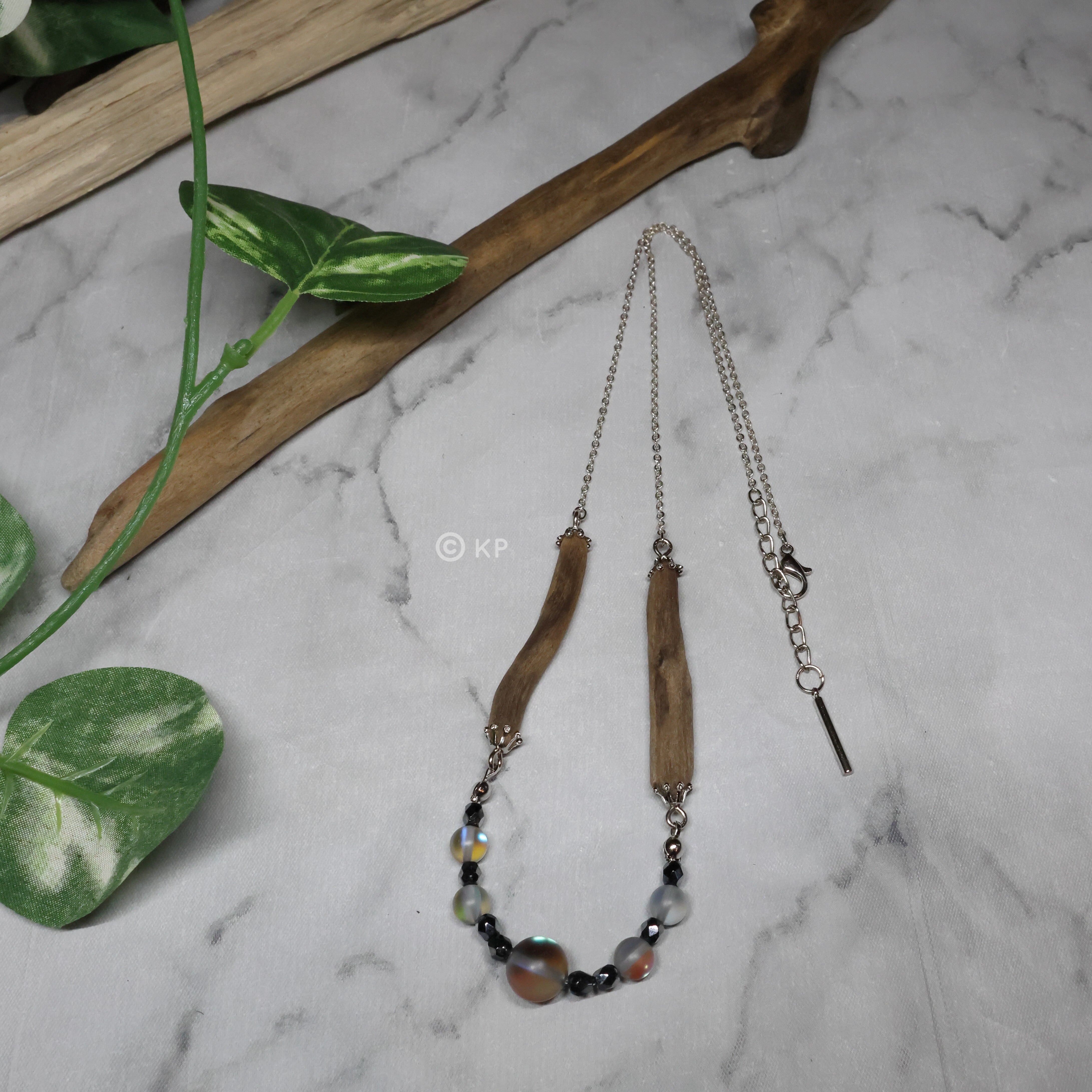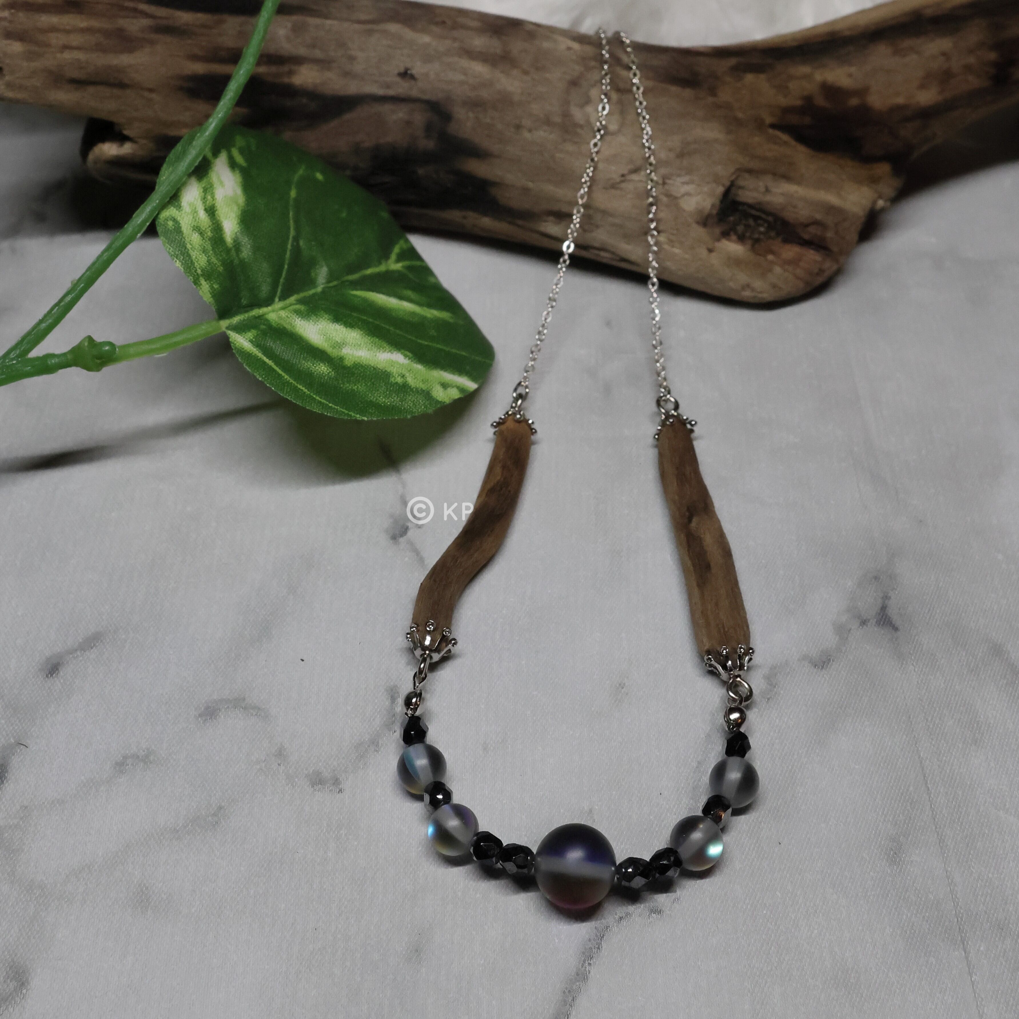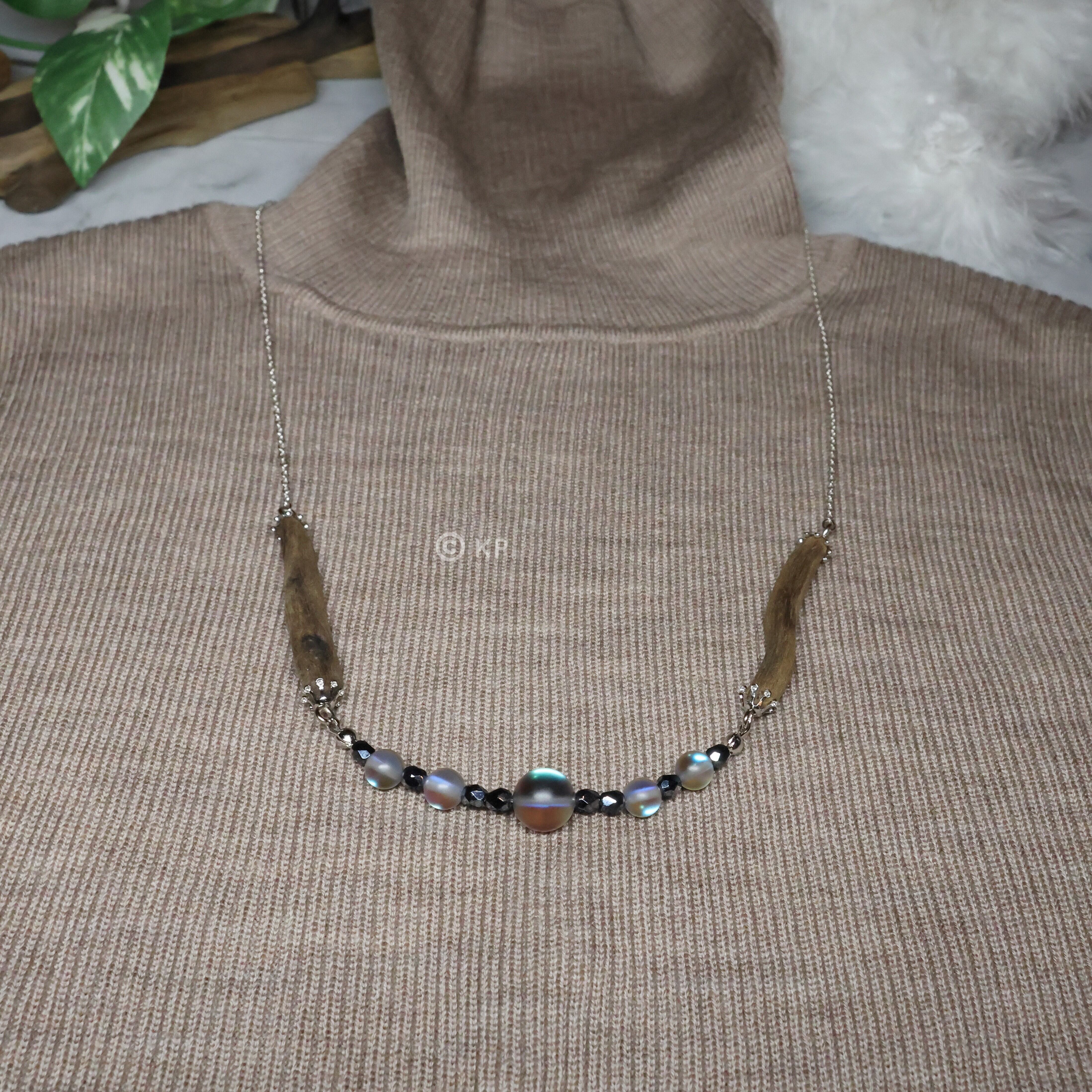 自然の温もりを感じることができる☆アクセサリー☆ ネックレス。流木とルナフラッシュを使用したハンドメイドの一点物で、独特のフォルムと光沢感が際立つデザインに仕上げました。流木の自然な質感とルナフラッシュの美しい輝きが融合し、あなたのコーディネートに特別な魅力を添えるアイテムです!日常使いはもちろん、特別な場面にも映える逸品としてお楽しみいただけます。